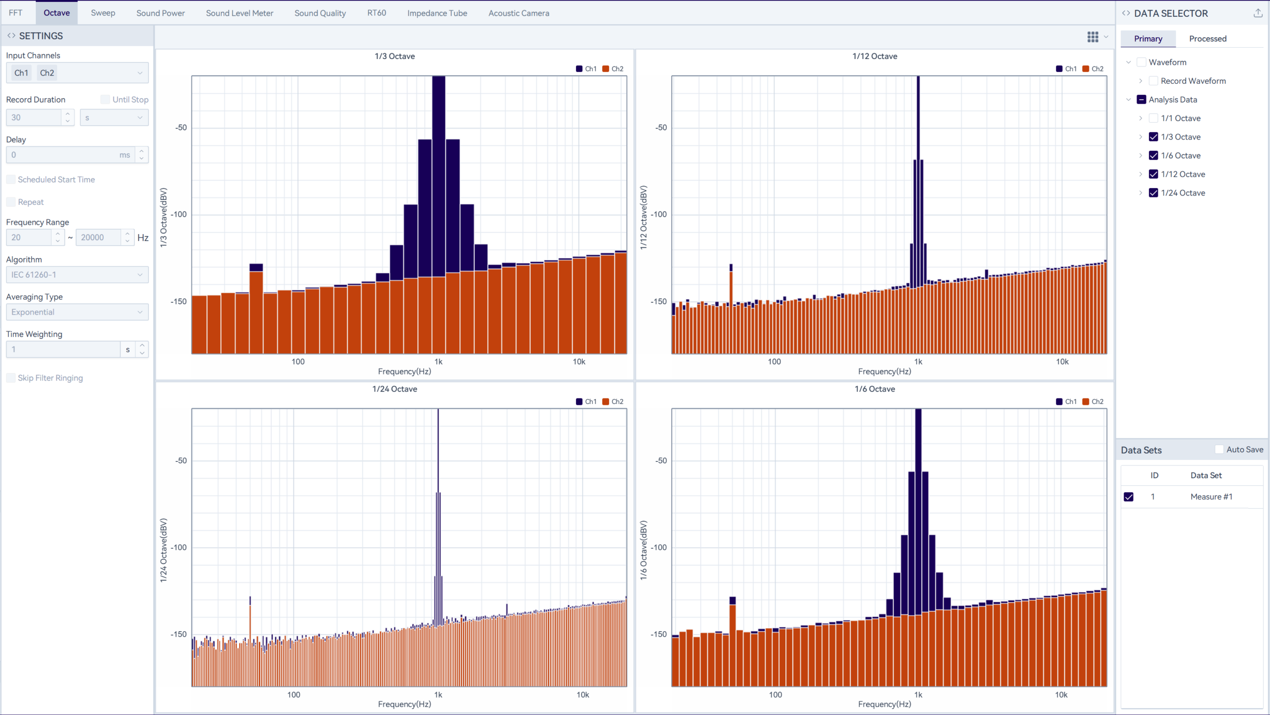 Octave analysis supports both FFT-based analysis and filter-bank-based octave analysis compliant with IEC 61260-1. Filter-bank-based analysis requires authorization to use.