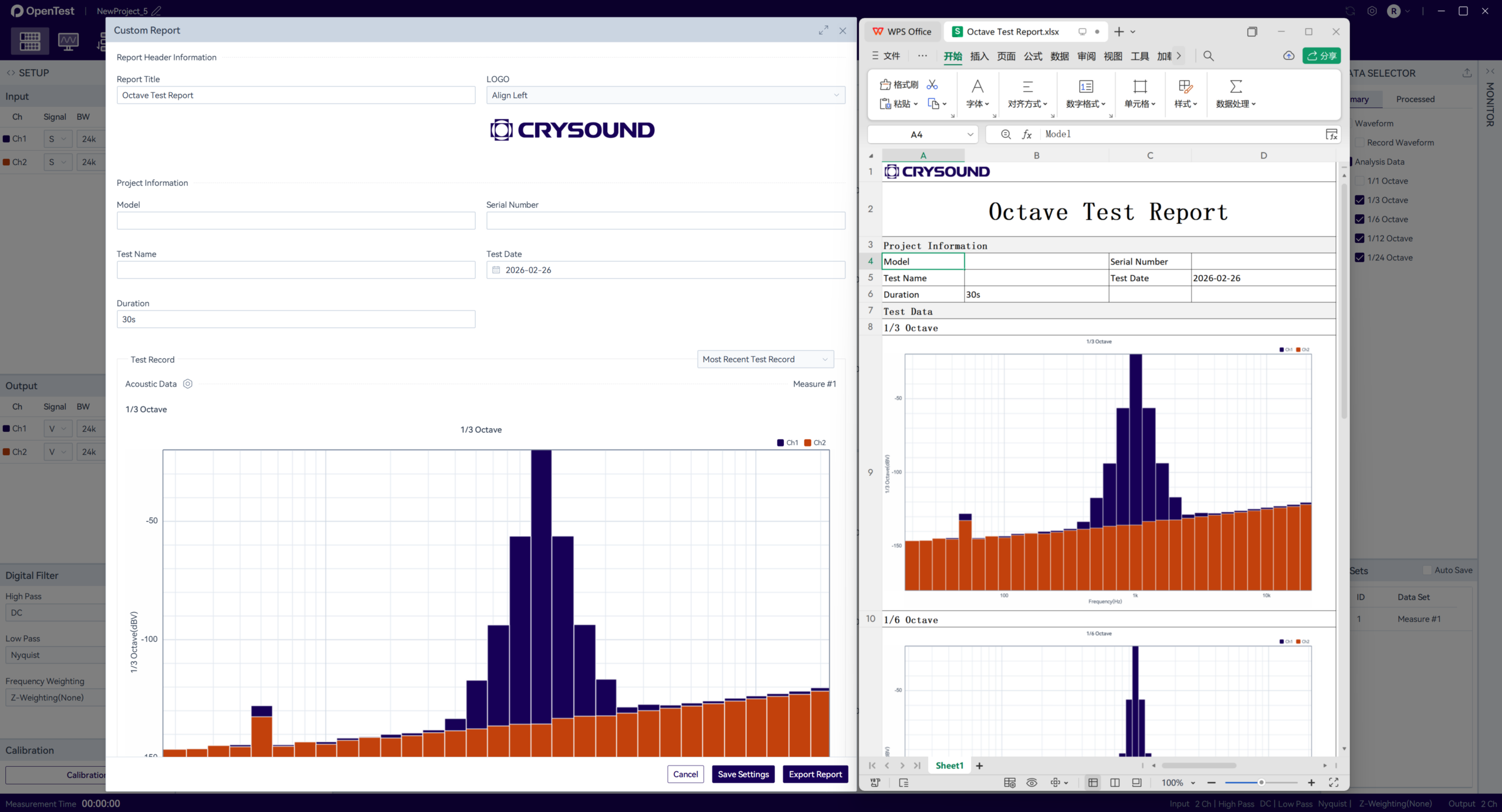 Configure test parameters in the settings panel, including selecting input channels and setting the acquisition time, frequency range, algorithm selection, etc. After the parameters are modified, they will take effect the next time the test is executed.