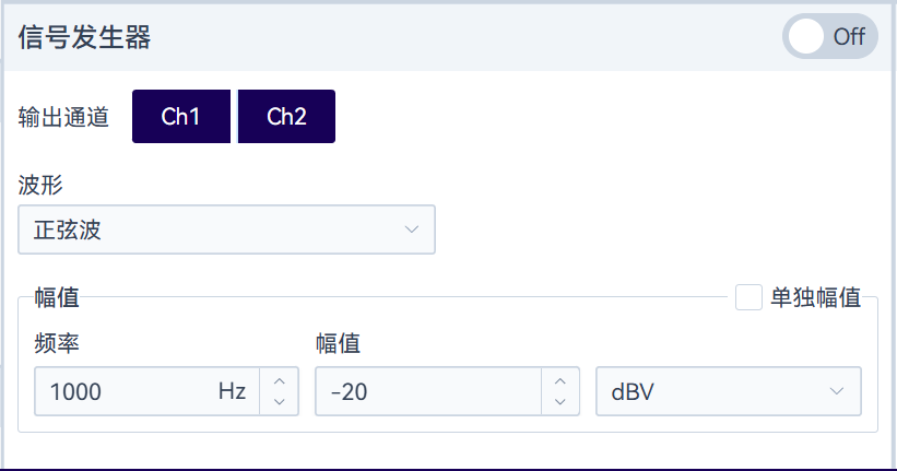 Docs 信号发生器 在测试面板中,设置了信号发生器。 开关按钮控制信号发生器的开启和关闭。开启信号发生器后,在扫频分析中,扫频过程会中断信号发生器,扫频结束后会自动恢复。 指定需要播放信号的输出通道,支持不同通道播放不同幅度的信号。信号类型目前支持正弦波(单音、双音、多音)、方波、噪声(白噪声、粉红噪声),以及上传指定的波形文件。