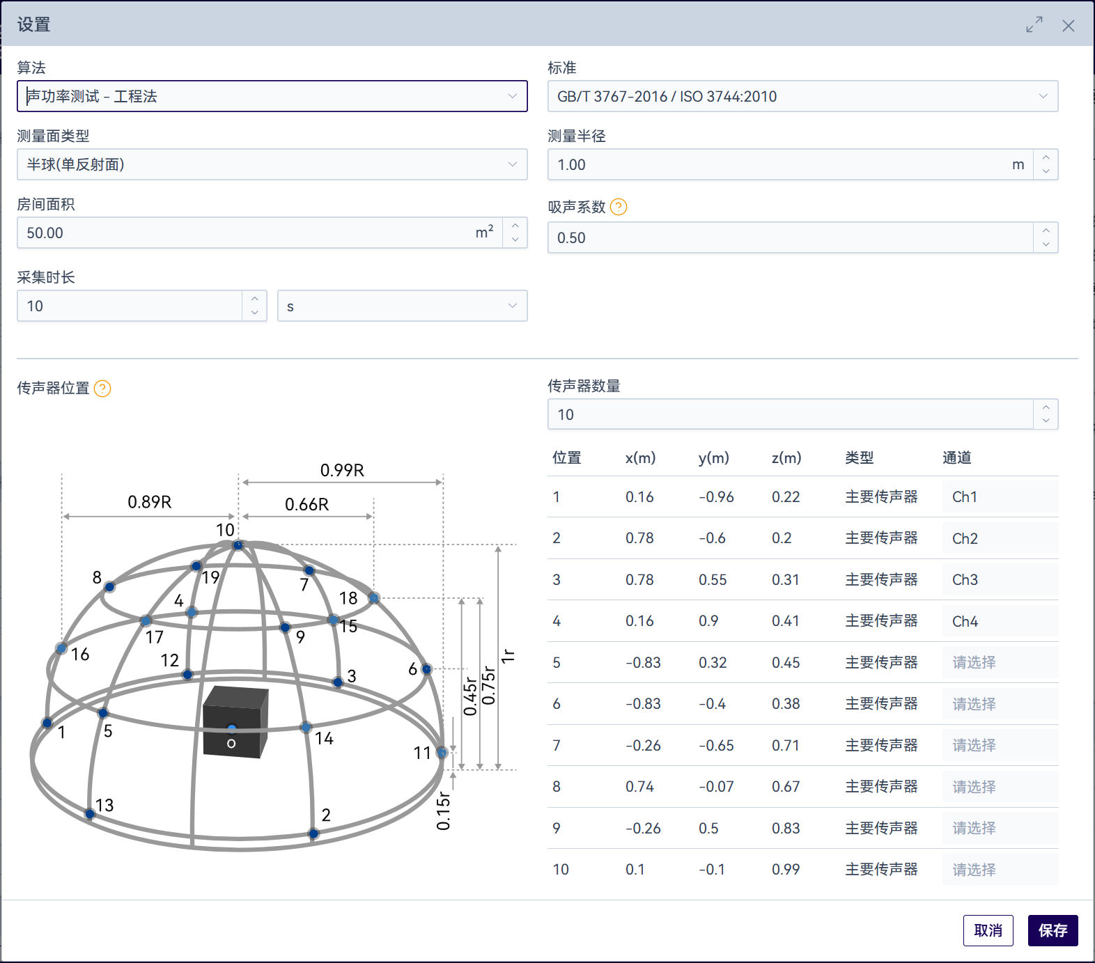 按标准要求搭建测试环境,软件中显示有不同测量面时的参考布点位置,完成配置后可以开始环境噪声采集。