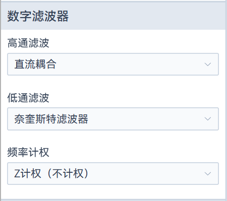 滤波器支持高通、低通、带通滤波,以及A/B/C/Z频率计权切换。通道设置中的滤波设置为全局设置,对实时分析和测量都有影响。