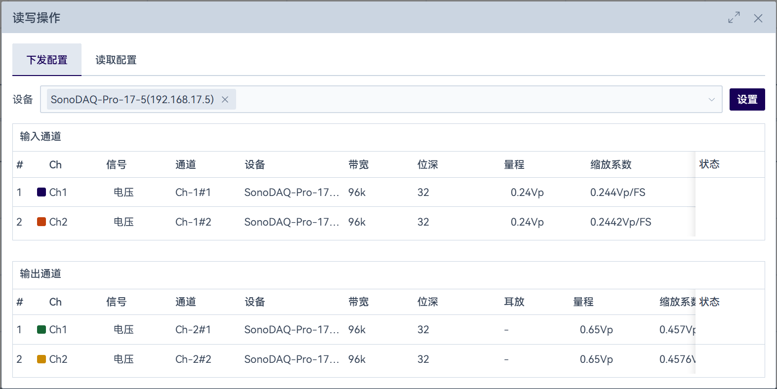在开启测试时,系统会检查工程中通道设置参数与设备端参数的一致性,当出现不一致时,可选择批量下发或读取设备端参数。选择设备,点击「下发/读取」按钮,可批量将工程中的通道参数设置到设备端,以及批量从设备端读取最新的配置数据。