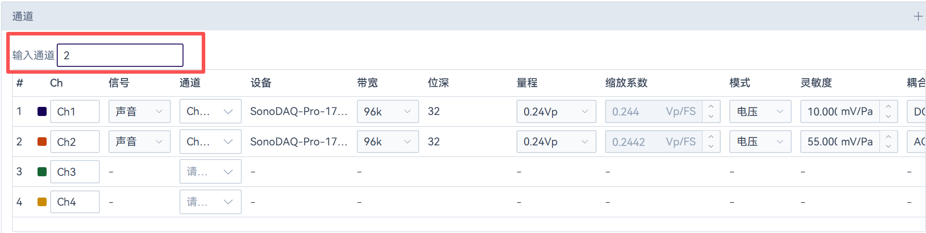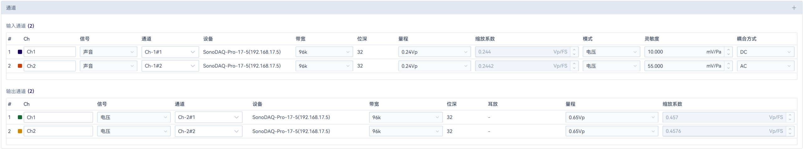 在设置栏中,仅支持信号类型、带宽、量程的修改,更多参数设置,需在硬件配置弹窗中进行操作。修改通道配置实时生效,参数根据设备类型的不同动态变化,包括但不限于量程、带宽、Vp/FS、信号类型、IEPE开关、灵敏度、耦合方式等。