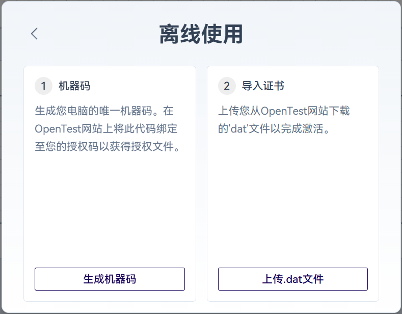 在登录弹窗中,点击「离线使用」按钮,点击「生成机器码」,复制此机器码。在OpenTest网站个人中心的「我的授权码」中,绑定到要使用的套餐中,所需要的套餐都绑定成功后,下载授权文件,系统会自动合并机器码与所有已绑定的套餐成一个文件。将该文件导入到客户端中,验证通过后即可离线使用OpenTest。