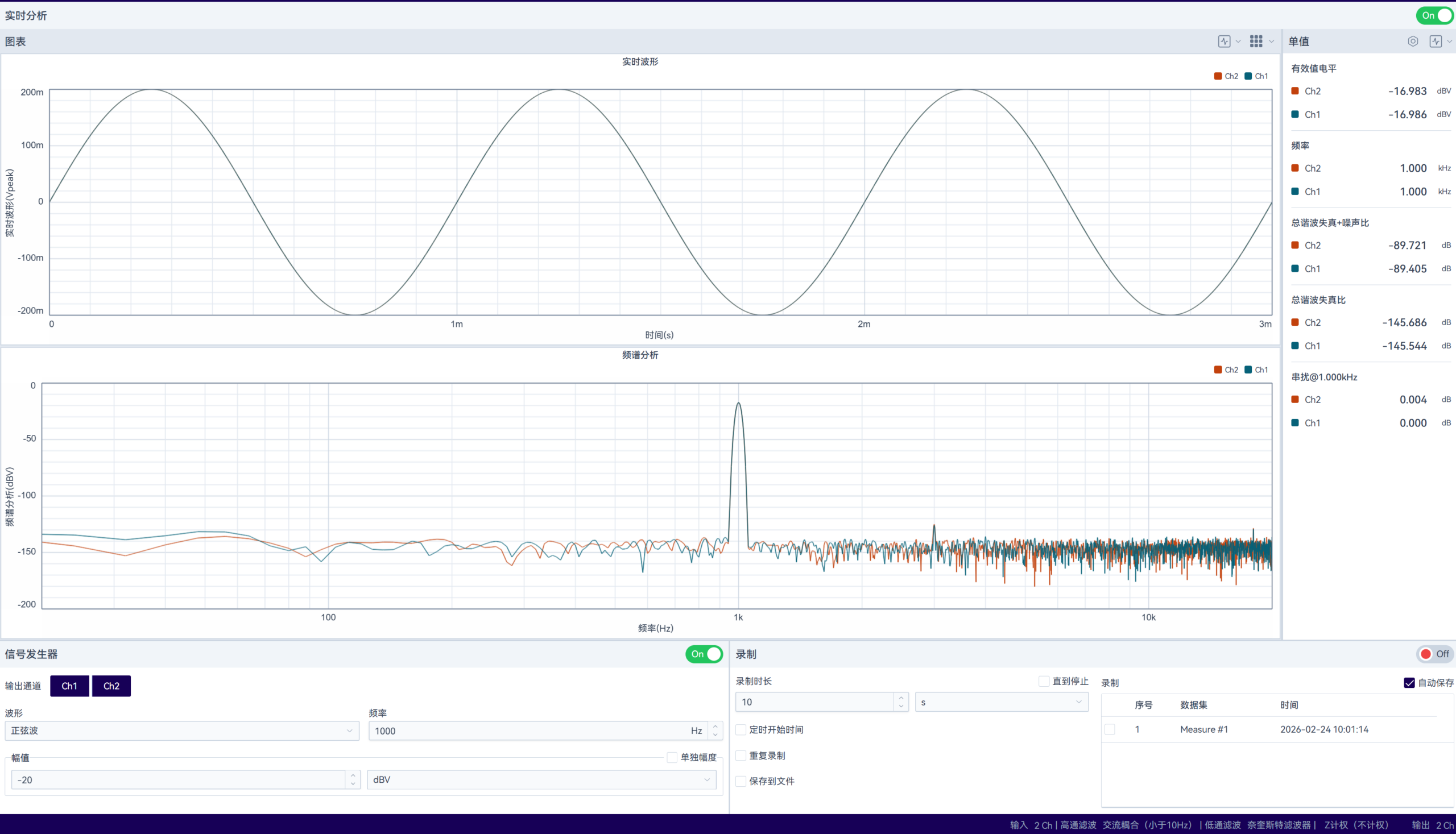 Docs 实时分析 实时分析面板在设置模块和测试模块都可以展开查看,便于在修改通道参数和测试过程中观察波形变化。实时分析包括实时监测、信号发生器以及录制三个主要功能。具体操作详见「3.4 实时分析」章节。